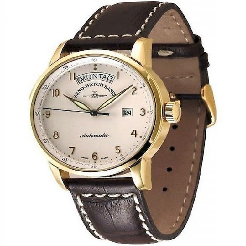 Marca: Zeno Watch Basel Grupo de productos: Relojes Grupo objetivo: Hombres Color de la caja: oro amarillo Cristal: cristal de zafiro Material de la correa: cuero ? Mm: 42 Material de la caja: acero inoxidable Color de la esfera: blanco ? Otro: Parte posterior de la pantalla Otro: Fabricado en Suiza Pantalla: Analógica Color de la correa: Marrón Superficie del revestimiento: Pulida Forma de la caja: Redonda Tipo de reloj: Relojes automáticos Tipo de movimiento: Automático Tipo de cierre: Hebilla de pasador