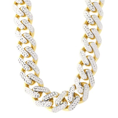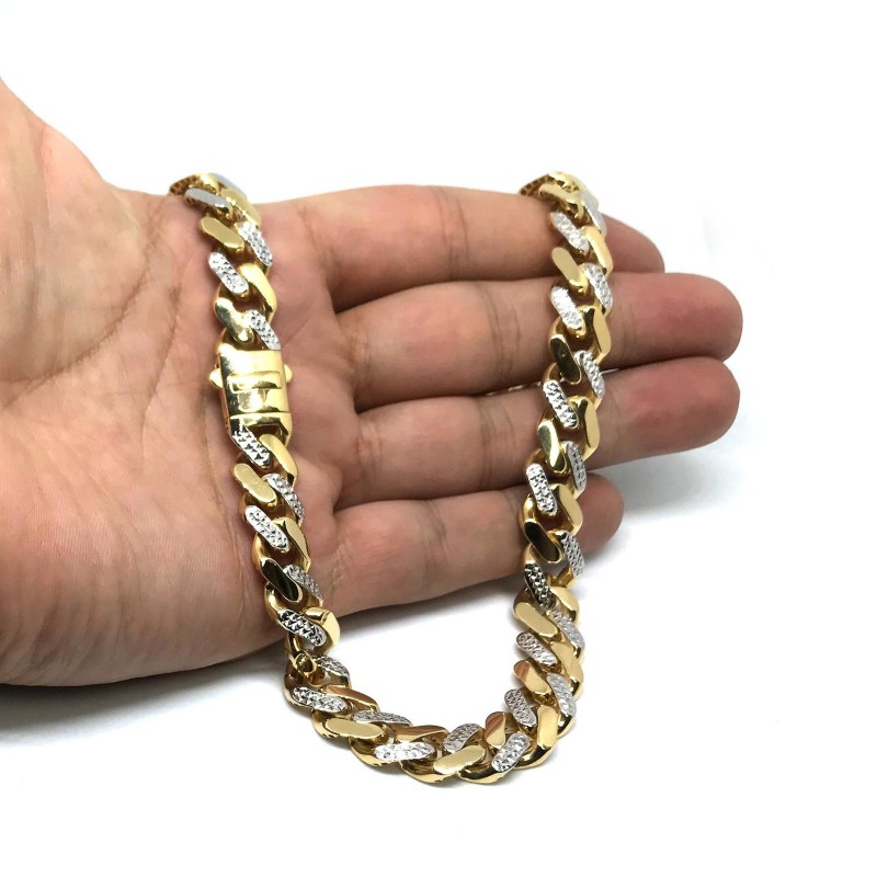 Esta cadena de eslabones cubanos de Miami de oro amarillo y blanco de 14 k ofrece un aspecto de collar moderno. Esta cadena mide 11,3 mm de grosor y está disponible en una longitud de 24 pulgadas. Perfecto para colgantes y también se puede usar solo. Incluye una caja con cierre a presión en ambos lados para mantener la resistencia y la comodidad y puede ser usado tanto por mujeres como por hombres. El collar pesa 41,3 gramos y está estampado con el sello de autenticación de metal de 14k. - Esta cadena está hecha de oro amarillo y blanco sólido genuino de 14k y está estampada con el sello de metal de 14k apropiado - Collar estilo cadena de eslabones cubanos de Miami ideal para usar solo o con colgantes - El ancho del collar es de 11,3 mm - El collar tiene un cierre de caja y tiene un acabado muy pulido que le da un aspecto brillante - Peso del collar en gramos: 41,3gr